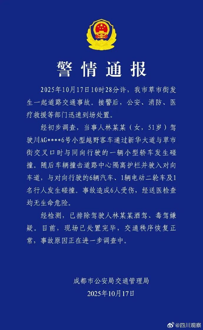 经初步调查,当事人林某某(女,51岁)驾驶川AG****6号小型越野客车通过新华大道与草市街交叉口时与同向行驶的一辆小型轿车发生碰撞。随后车辆撞击道路中心隔离护栏并驶入对向车道,与对向行驶的6辆汽车、1辆电动二轮车及1名行人发生碰撞。事故造成6人受伤,经送医检查均无生命危险。经检测,已排除驾驶人林某某酒驾、毒驾嫌疑。目前,现场已处置完毕,交通秩序恢复正常,事故原因正在进一步调查中。