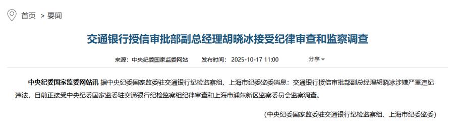 据中央纪委国家监委驻交通银行纪检监察组、上海市纪委监委消息:交通银行授信审批部副总经理胡晓冰涉嫌严重违纪违法,目前正接受中央纪委国家监委驻交通银行纪检监察组纪律审查和上海市浦东新区监察委员会监察调查。